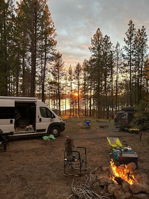 There aren’t many campgrounds in the Fremont-Winema NF, but there are plentiful established dry camps with fire rings and some with picnic tables. Tim, N7KOM, and his SOTA pup Lance and I drove down early on a Friday to see if we could secure a spot at the ‘First come, first serve’ East Bay Campground at Thompson Reservoir. We were able to grab one of the last available spots, though it didn’t have a table, just a fire ring. Since we always have an extra table in BGNOUT, we decided to take site 15 rather than site 14, which had a table but not fire ring. The Fremont-Winema NF is relatively remote and one of the least funded forests in Oregon, so it seems like recreation support budget is pretty tight. This is exemplified by the state of the facilities around the campground so be prepared. There was toilet paper, but I wouldn’t plan on it.