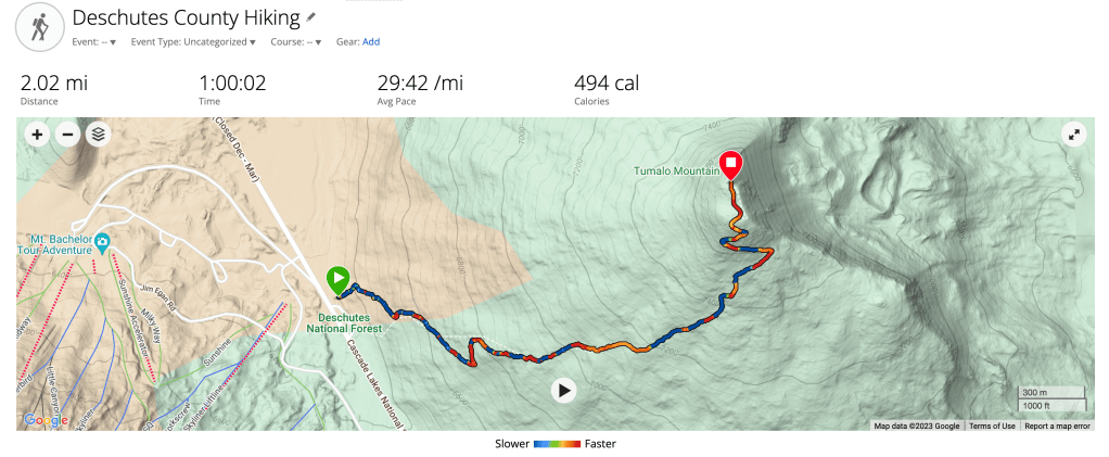 Tumalo Mountain is a shield volcano in the Cascade Range of central Oregon, located just northeast of Mount Bachelor across the Cascade Lakes Scenic Byway.1 The Tumalo Mountain trail is accessed from the Dutchman Sno-park, 20 miles from Bend, OR. The 2 mile trail climbs 1400 vertical ft, it is steep but has a fair amount of shade on the lower section but is pretty exposed as you climb higher. Once on top you are rewarded with close up, 360 degree views of the Central Oregon Cascade Range, Mt. Bachelor, Broken Top, Three Sisters and Newberry Crater.