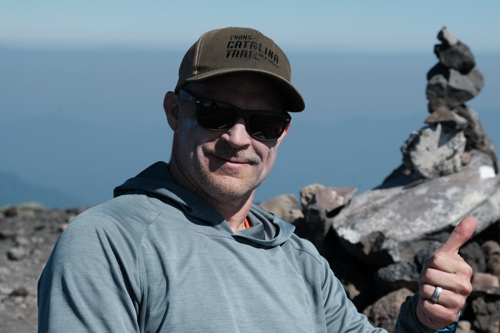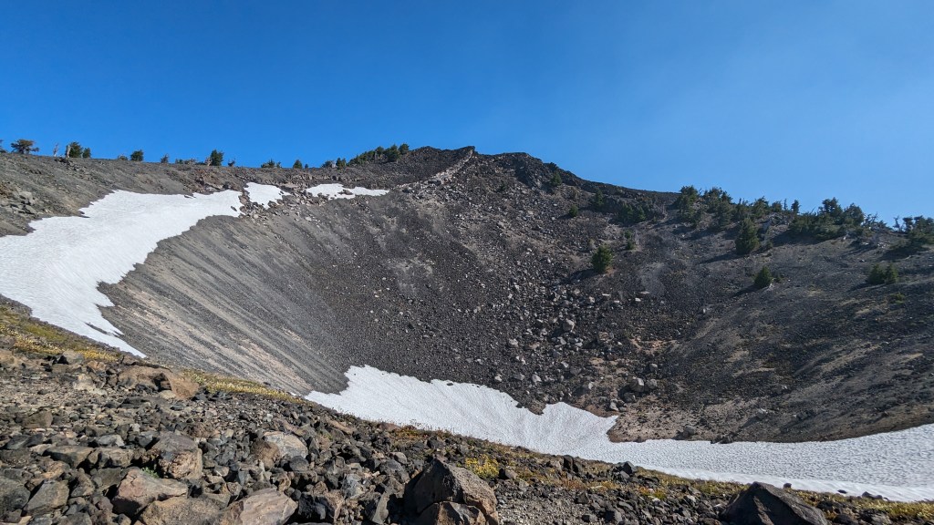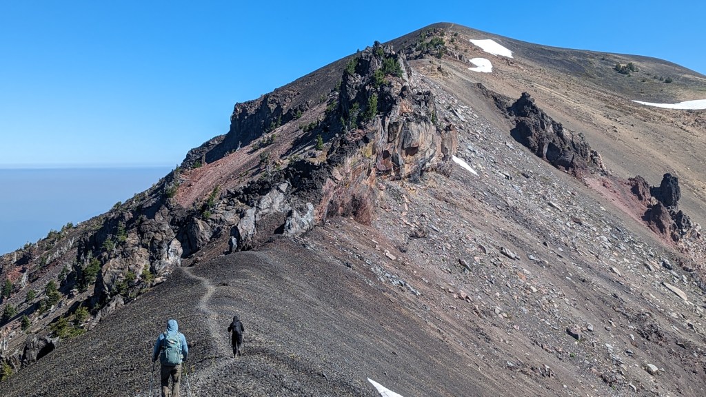Upon reaching the crater you are treated to a fantastic view of the surrounding landscape, Mt Thielsen (W7O/CS-002) to the East, Mt Scott (W7O/CS-003) to the South East, Garwood Butte (W7o/CS-036) to the South West and Sherwood Butte (W7O/CS-039) to the South. The trail gets a little more challenging here on out, with very loose pumice, sand and rocks. There is a very short section of more technical trail after descending the false summit where the trail traverses the SE side of the summit ridge. This was the only place I felt a bit nervous as a wrong foot placement could result in a fall down a very steep slope. I made a very conscious effort to double check every foot hold for security and ensured that my trekking poles where solidly planted.