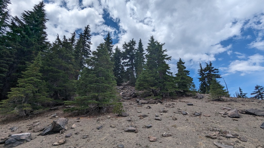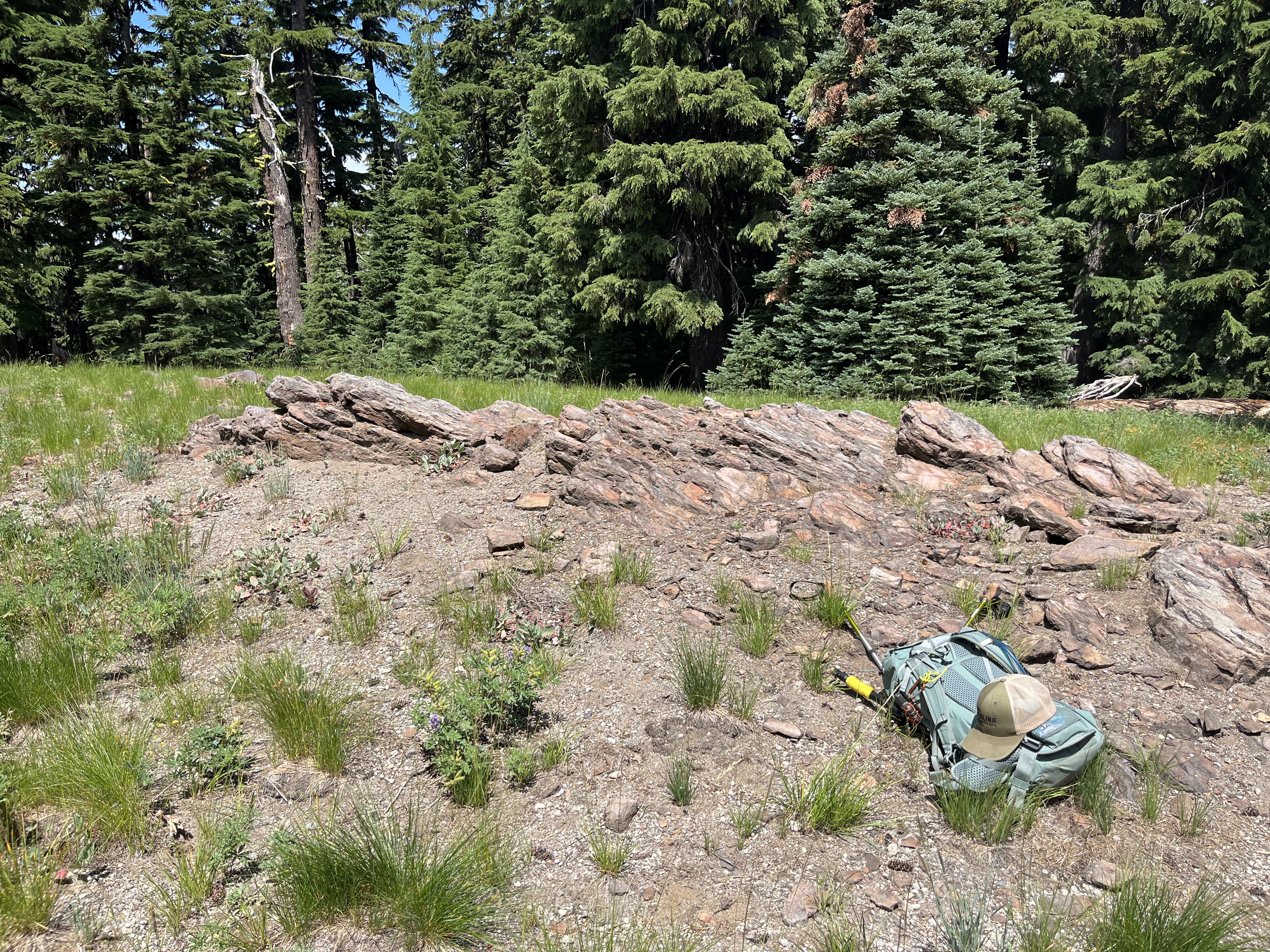 Once you crest the short climb, there is a little more traversing on the ridge top before you hit a large meadow of lava rock and some obsidian. The summit is now pretty much due west and fairly obvious with a small rock bench near the top and a second larger outcropping at the true summit.