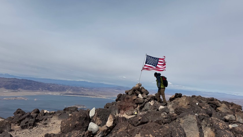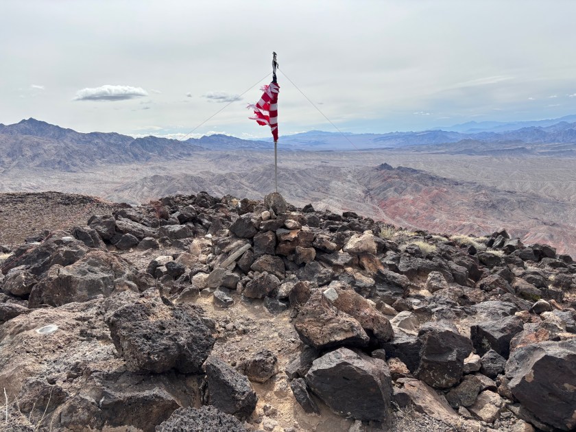 The summit is a 360 view of the surrounding desert mountains to the East and Lake Mead and the Hoover Dam to the West and Southwest. As previously reported, there is an ammo box log book and a flag on a pole.