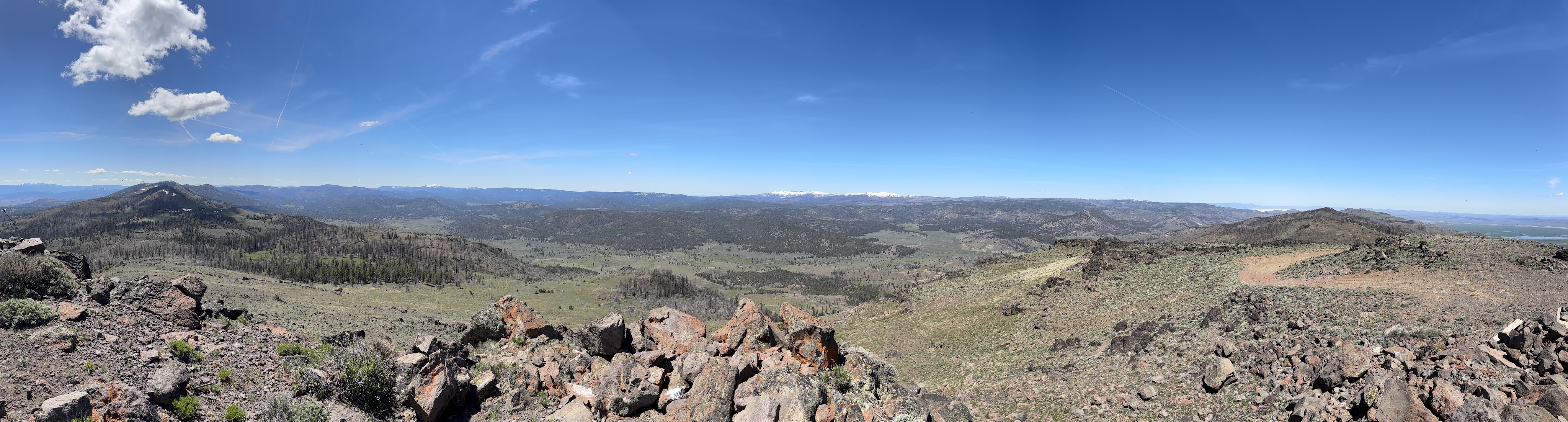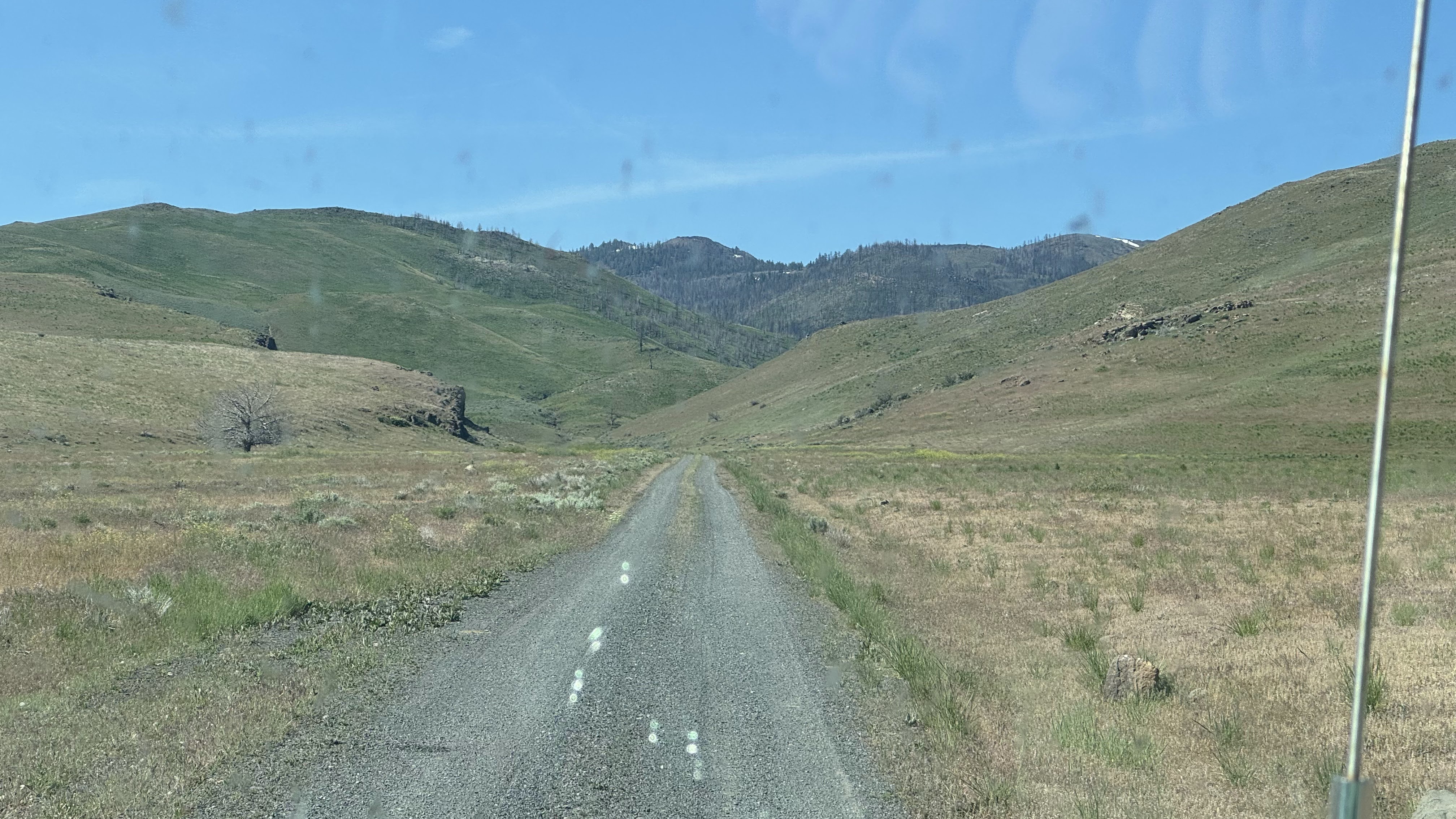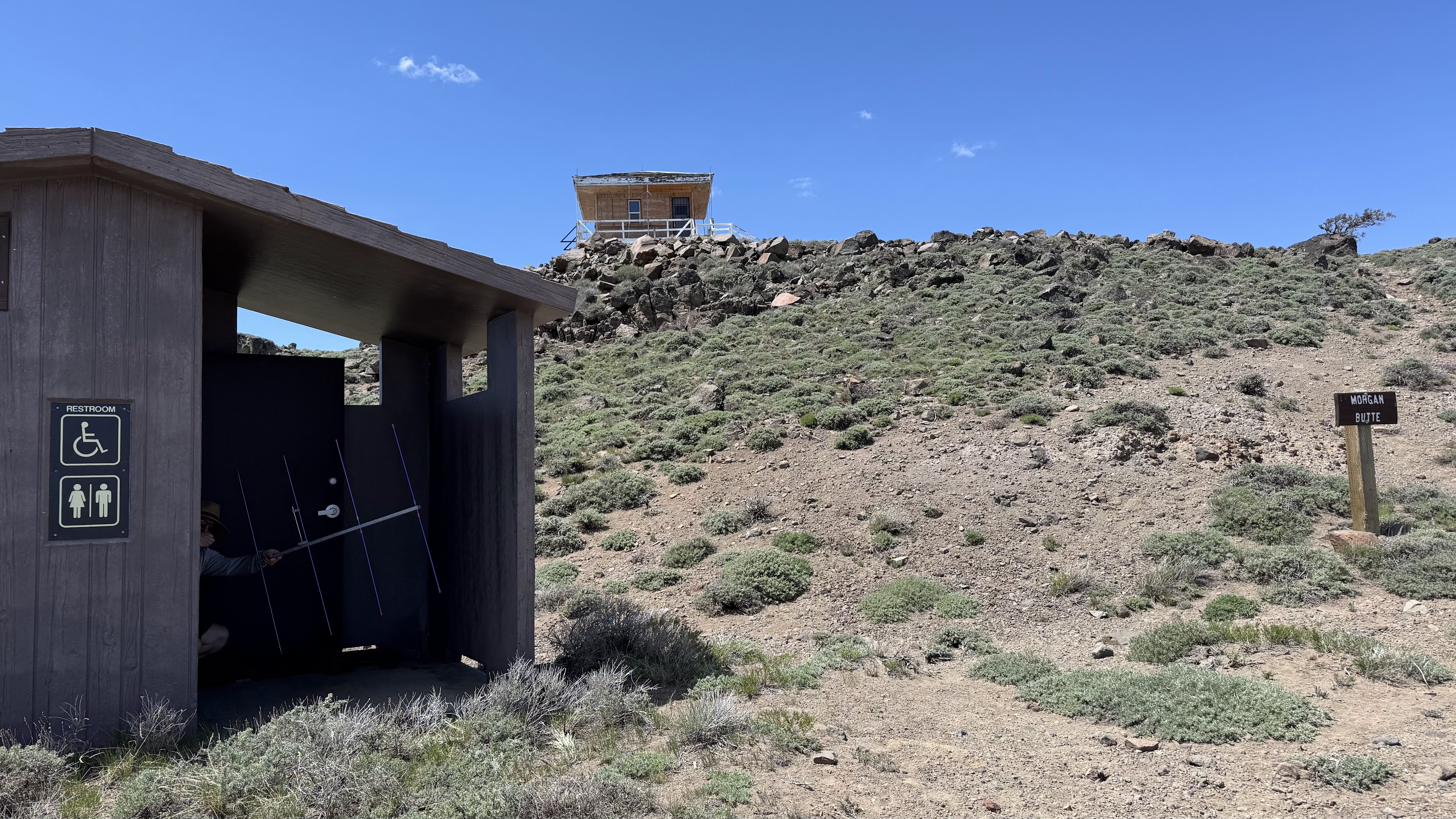 Morgan Butte is a drive near, located approximately 15 mile South of Paisley, OR in the Fremont-Winema National Forest. It is topped with a fire lookout cab and a vault toilet. The route is partially paved, but the last 7 or so miles is on well maintained forest service roads that traverse an area burned in fires the summer of 2024. The last mile is gated just past a trail head sign, we parked the van here and walked up the easy last mile.