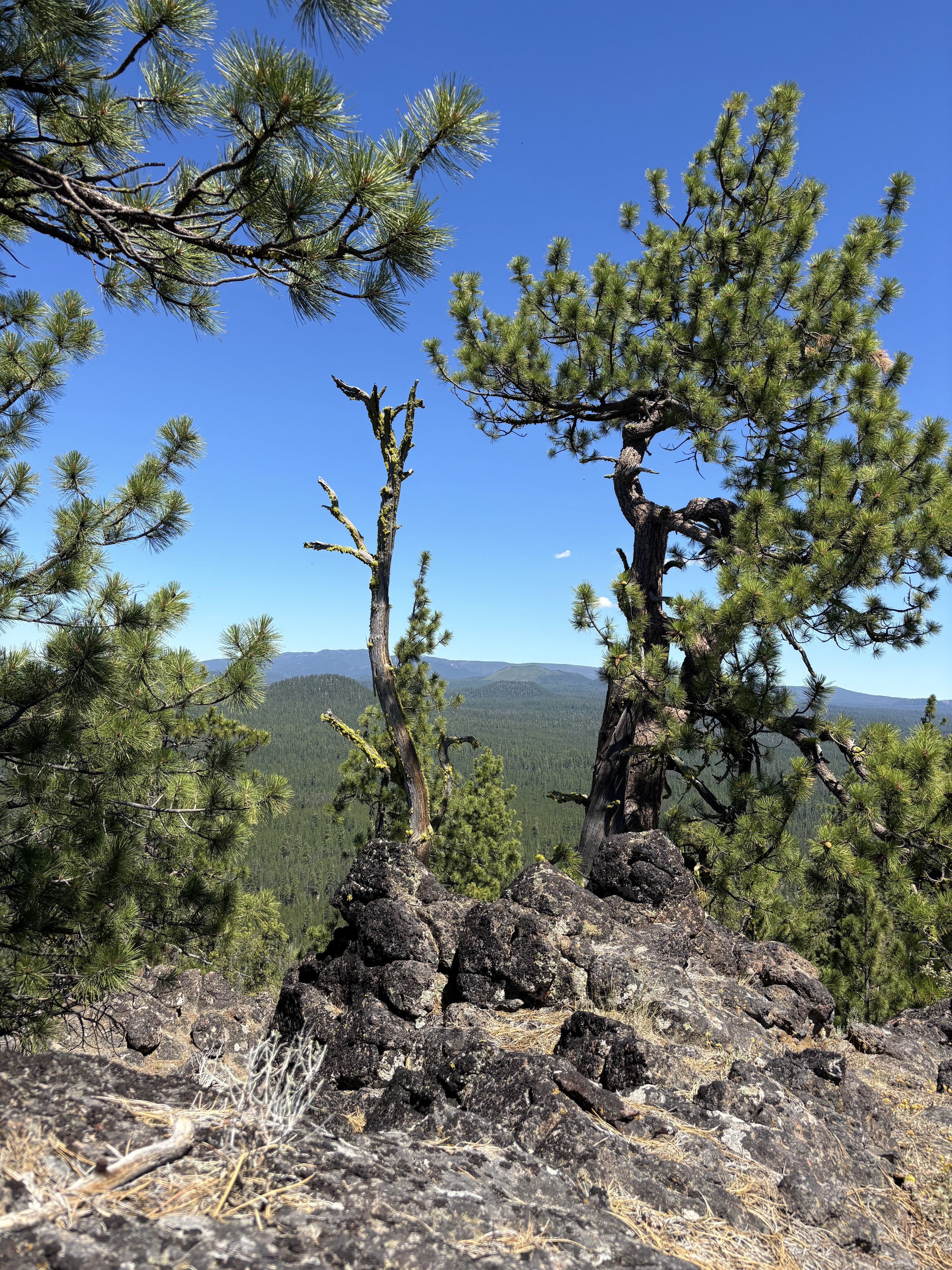 We approached the summit block from the south and had to scramble a little to get on top, however the track that we took down was much easier and no scrambling. Once on top we were very pleasantly surprised at the views and the setup. There are a couple of old pines providing shade, and an old stump to tie a mast off to. 360 degree views of the South Side of Newberry Crater, the South Central Oregon Cascades and a great view of Fort Rock out to the South.